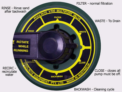 Backwashing should be done whenever the pressure increases on the filter gauge, when the water flow decreases or cleaner stops working, or every 2-3 months. To backwash your filter simply turn the multiport valve handle (the handle on top or beside the filter with a number of options such as Filter/Rinse/Waste etc). Make sure the pump is off (never turn the valve with the pump on). Turn this handle to the backwash position . Then switch on the pump. This will wash water through the filter washing any dirt down the drain. You should be able to see this water through either a sight glass on the valve or through a clear section of pipe, otherwise watch the water pouring into the drain. When the water starts to clear, switch off the pump and turn the handle to rinse. Run the pump on rinse for approximately one minute to rinse any disturbed dirt from the filter so it does not go back into the pool. Some older filters may not have a rinse function. Backwash these until the water is clear to avoid sediment returning to the pool. Return the valve to the filter position when finished and your pool can be used as normal. Diatomaceous earth filters need to be thoroughly disassembled and cleaned every 6-12 months. If you find the pressure increases rapidly again after backwashing you may need to disassemble the filter. If you have persistent high pressure problems with a sand filter contact a pool shop for assistance.